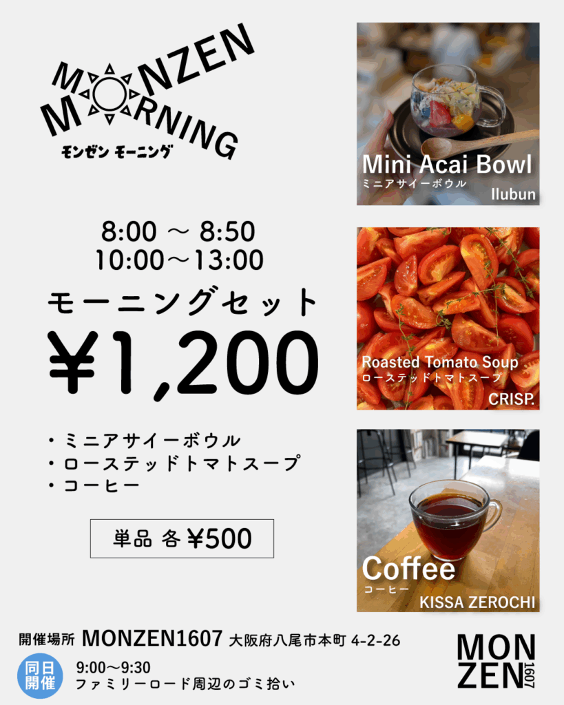 Small Good Morning 小さな良い朝を、みんなで重ねる試み。これは、特別じゃないけれど、ちょっと気持ちのいい朝を集める活動。動くことで身体が目覚め、拾うことで街とつながり、食べることで心と身体が整っていく。「MONZEN1607」を目的地に、動く・拾う・食べる そんな小さな循環を重ねていく朝の時間です。暮らしのリズムに、ほんの少しの いいこと を。