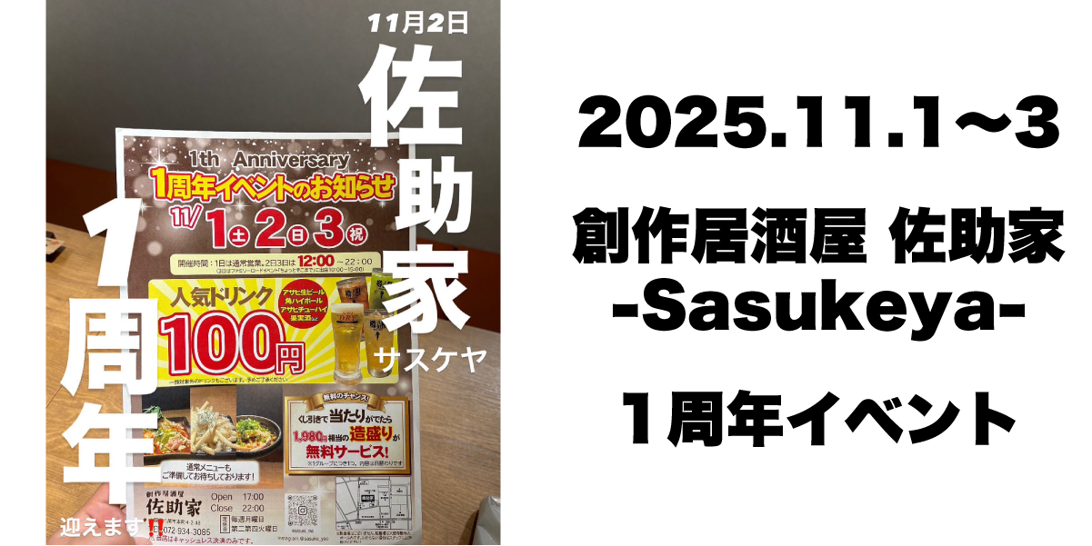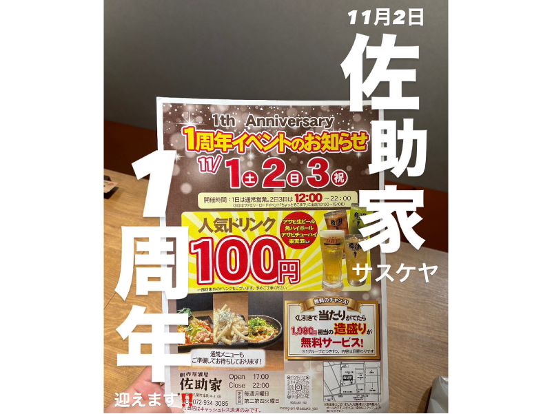 いつも当店をご利用いただき誠にありがとうございます。『創作居酒屋 佐助家ーSasukeyaー』2025年11月2日で1周年迎えます!✨